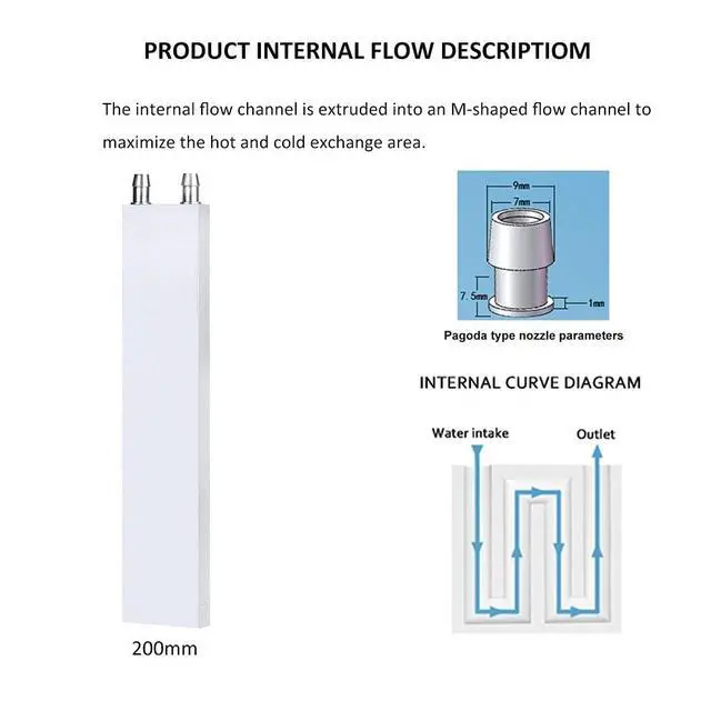 Aluminum Brazing-The pagoda nozzle: minimum outer diam7mm-Polishing working surface and better heat absorptionFeatures: The internal flow channel is extruded into an M-shaped flow channel to maximize the hot and cold exchange area. The pagoda nozzle has a minimum outer diameter of 7mm and can be connected to an inner diameter of 7-8mm Water pipe. Applicable to computer CPU, graphics gpu heat, motherboard, xbox consoles cpu, graphics, semiconductor cooling piece, industrial inverter driver, laser head cooling and industrial control cabinet cooling.