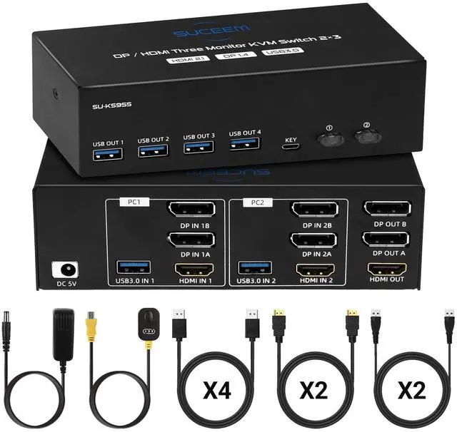 Complete PackageThe package includes everything you need for seamless setup: 1*KVM Switch, 4*DP 1.4 Cables, 2*HDMI 2.1 Cables, 2*USB 3.0 Cables, 1*Wired controller, 1* Power adapter, 1*User manual. ^^ Three MonitorsKVM switch allows 2 computers to share 3 monitors ( 2 DP and 1 HDMI ) and 4 USB 3.0 ports, such as mouse, keyboard, printer, U disk, etc. It also support extended and copy mode display.