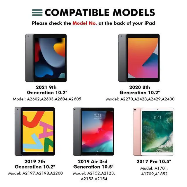Compatibility: The case is designed for iPad 10.2 & 10.5 inch, which is compatible with the latest iPad 9th 2021 (A2603/A2604/A2605), 2020 iPad 8th genneration (A2270/A2428/A2429/A2430) / iPad 7th generation 10.2 inch 2019 (A2197/A2198/A2200), iPad Air 3 2019 (A2152/A2123/A2153), iPad Pro 10.5 inch 2017 (A1701/A1709). Not compatible with any other iPad models.