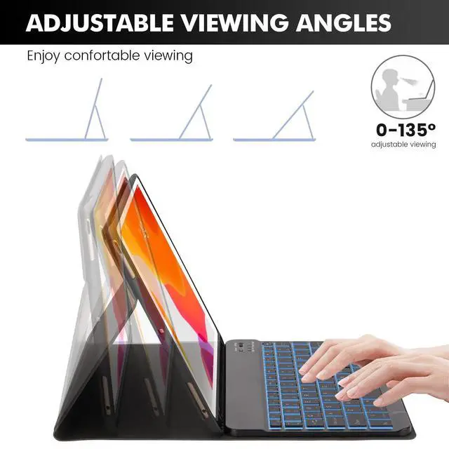 ^^ Detachable & Adjustable: Designed to stand your iPad hands free so you can focus on work, reading, watching videos, typing like on normal computer laptop. Innovative magnetically detachable wireless keyboard design makes it easy to use (the connection range is up to 10 M). And iPad protective case can be adjusted to different angles according to your needs, provides more comfortable feeling of use.