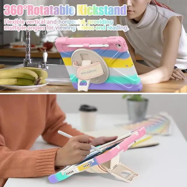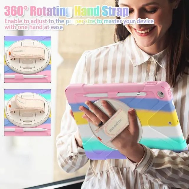 Adjustable Hand Strap: The Case for iPad 9th/8th/7th Generation Built-in kickstand for vertical & horizontal viewing (perfect for videos, reading, or meetings). Ergonomic hand strap fits all hand sizes (adults, kids, students) ^^
