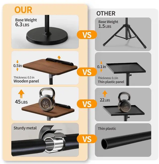 Sturdy Design: The 6.3 lb metal base with a full-cover anti-slip pad and strong support pole supports up to 45 lbs, ensuring stability even in windy conditions. The compact, round base saves space compared to traditional tripods laptop floor stand and is easy to assemble in under 5 minutes, offering convenience and comfort ^^ Wooden Panel & Book