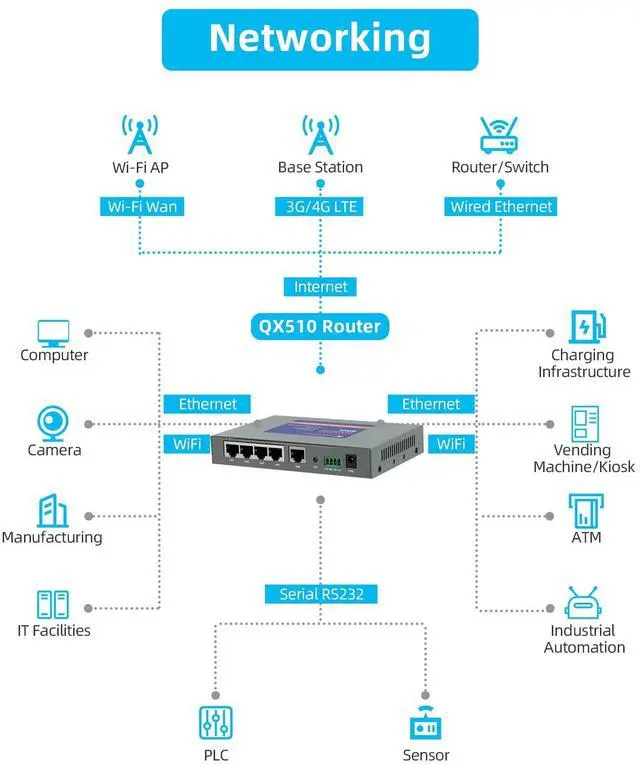 Ethernet Network: Insert SIM card, plug and play (some SIM card may need to follow the manual to set APN). QX510 4G LTE router can share the 4G network with your electronic devices in places without broadband coverage anytime/anywhere. Its LTE CAT4 module supports B2/4/5/12/13/17/B18/B25/26/41, covering most frequency bands of US (ex T-Mobile and EIOTCLUB, SIM base sim card), NOT FOR Verizon/ATT. Support Canada, Mexico. It is unlocked. ^^ Industrial
