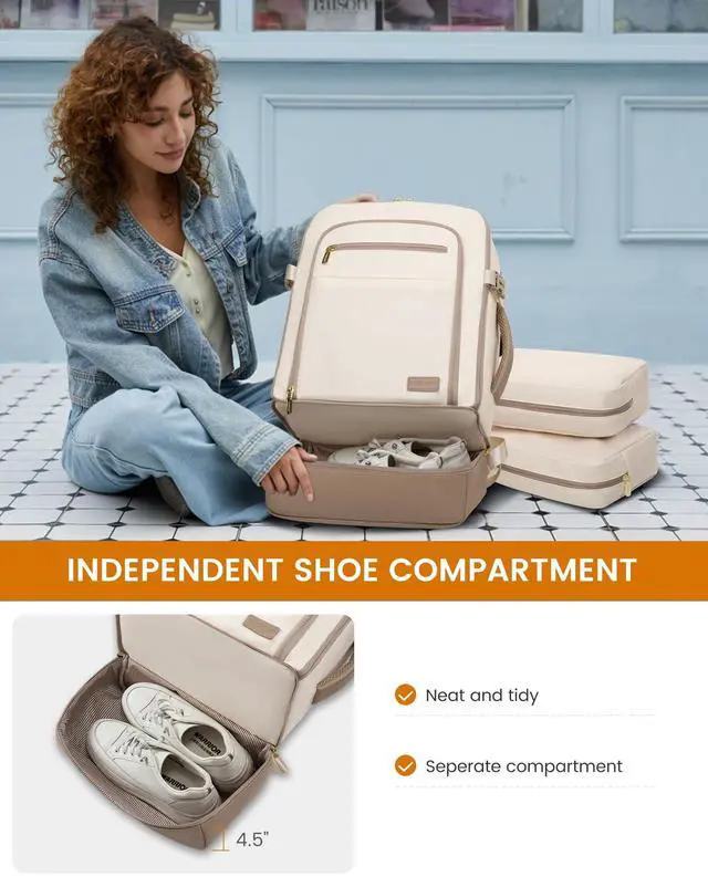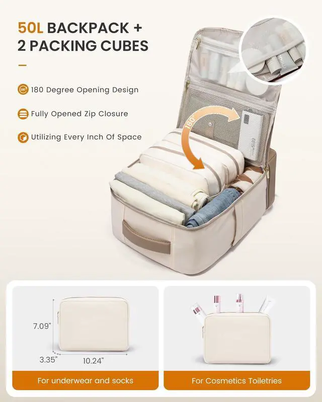 INDEPENDENT SHOE COMPARTMENT & 2 FREE PACKING CUBESThis carry on backpack for women comes with 2 packing cubes to store your underwear or toiletries. Separate flat bottom compartment of this travel bags for women can hold your shoes or dirty clothes for easy separation from clean clothes when traveling. Ideal for travel, business trips, or daily use. ^^ LARGE BACKPACK WITH MULTIPLE POCKETS This 50L travel backpack easily fits 3-7 days' worth of travel essentials. It features multiple compartments, including quick-access document pockets, a hidden theft-proof pocket, and a suitcase-style 180 opening main compartment that holds 5-10 sets of summer clothes, complete with two storage bags for organization.
