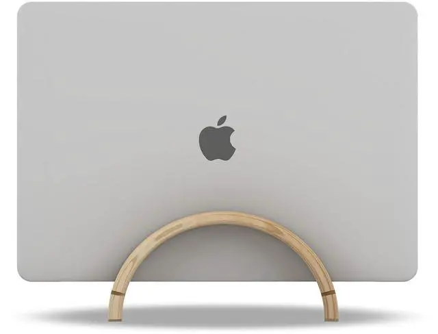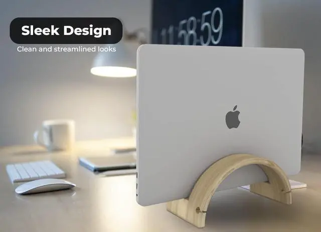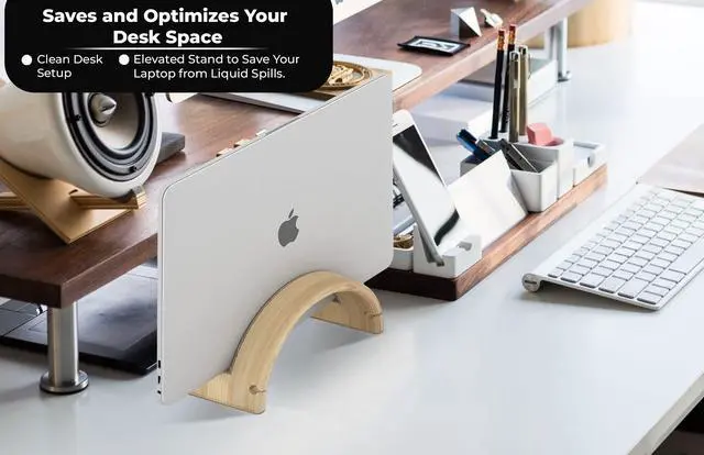 KOTHAR VERTICAL LAPTOP STANDUsually, you keep your laptop flat on your desk, but this takes up quite some space. Take for instance a 13-inch MacBook Pro. Flat on your desk it takes up 11.97 in ( 30.4 cm) to 8.36 in ( 21.2 cm). However, with the Kothar vertical laptop cradle (4" x 7") allows you to use or intelligently display your laptop while its closed and in an upright position to maximize your valuable desk space. STURDY BAMBOO FRAME & PADS PREVENTS SLIDINGThe stand is made of high quality bamboo and has a wide non-slip rubber base to make sure that your laptop stands securely on your desk.