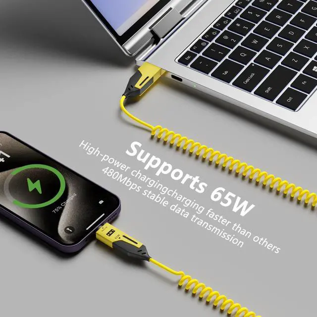 Fast Charging & Data Transfer: The usb c coiled cable equipped with advanced copper wiring for 65W PD fast charging, this usb a to usb c cable powers up phones to 70% in just 30 minutes. It also supports 480Mbps high-speed data transfer, making file syncing faster than ever ^^