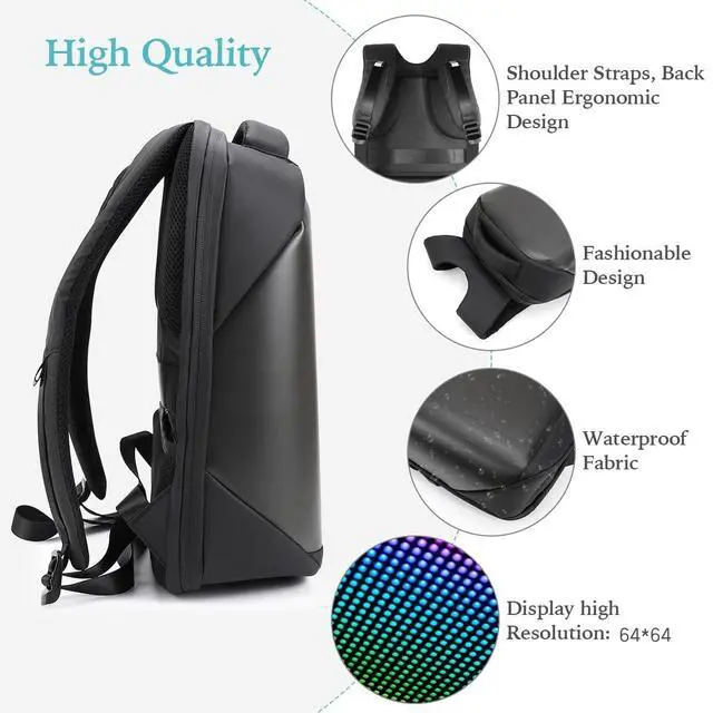 Unique LED Backpack 64 x 64 pixel LED color screen panel, can dynamically display pictures and animations, there is a rich library of cool theme styles in the APP, you can load your own pictures and GIF animations from your phone, or you can customize it in the APP and scribble creative pictures and text. Suitable for commuting, travel, cycling, outdoor adventure, work etc. It can make you stand out in the crowd. ^^ Practical & Stylish LED screen backpack has a stylish shape and ergonomic design, adjustable wide shoulder straps, mesh back panel, comfortable and breathable stability.
