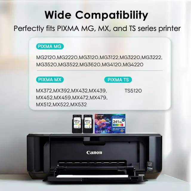 Upgraded Chips: For canon 241xl color ink cartridge is equipped with the latest smart chips to ensure compatibility and allow you to monitor and track ink levels. ^^ For Canon MG3620 Ink Cartridges Printers List: Compatible with Pixma MG3620, MG3600, TS5120, MG2120, MG2220, MG3120, MG3122, MG3220, MG3520, MG4120, MG4220, MX372, MX392, MX432, MX439, MX452, MX459, MX472, MX522, MX532 (please confirm your printer).