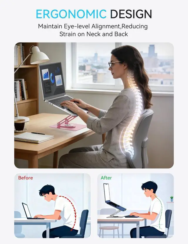 • Heavy and Stable: Made of high-quality metal material, the laptop stand base is heavier than normal laptop risers made of lightweight aluminum alloy; and upgraded joint screws keep the laptop stand stable at the desired height and angle, providing less wobbling and more stability.