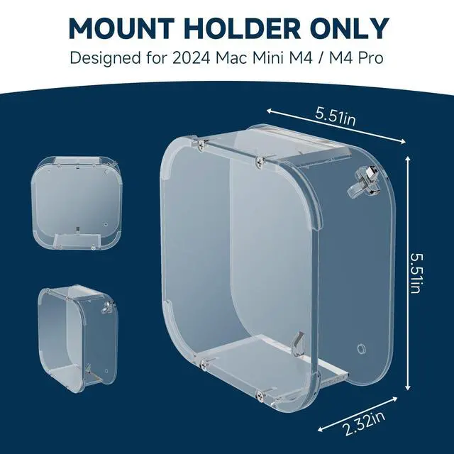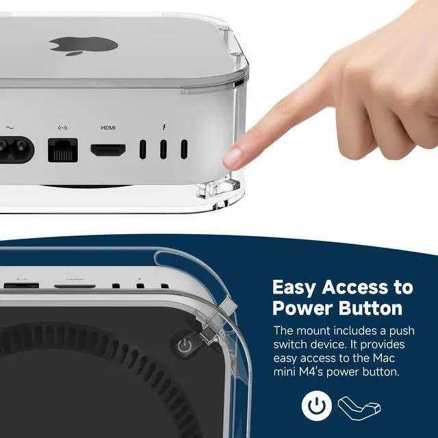 It provides easy access to output jacks and cables, and features a push-switch device within the holder for convenient access to the power button on the bottom of your Mac Mini M4. ^^ Versatile Workspace SolutionThe mounting system for the Mac Mini M4 Pro offers flexibility in placementwhether on your desk, wall, or under your desk. Position your mini computer almost anywhere to create a simplistic, aesthetically pleasing workspace. ^^ Hassle-Free InstallationInstallation is quick and easy, taking only a few minutes. Use it as a wall mount, under-desk holder, vertical desk stand or protective case for your Mac Mini M4.
