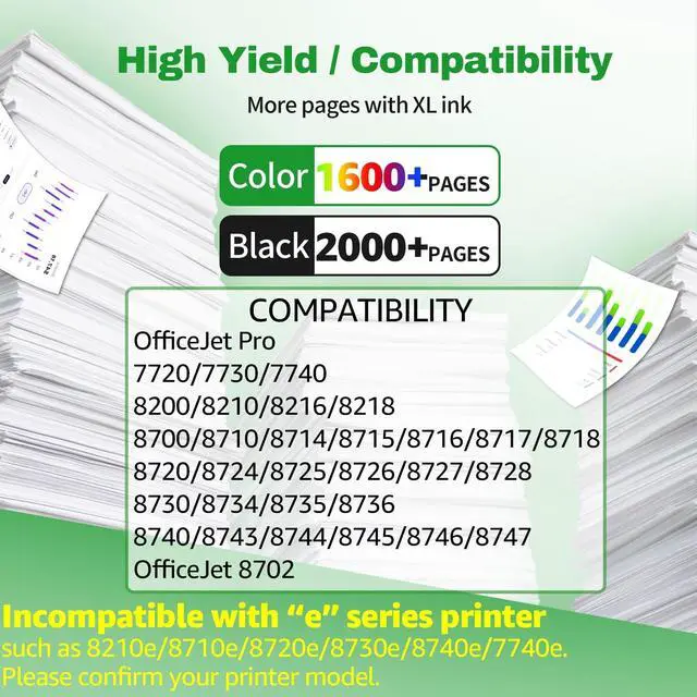 Less: Boast impressive page output based on 5% coverage: up to 2, 000 pages per 952XL black cartridge and 1, 600 pages per 952XL color cartridge. Say goodbye to frequent cartridge replacements and less time on reorders. ^^ Latest Chip Technology for