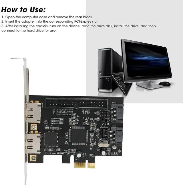 Use: 1. Open the computer case and remove the rear block2. Insert the adapter into the corresponding PCI-Expres slot3. After installing the chassis, turn on the device, read the drive disk, install the drive, and then connect to the hard drive for usePackage