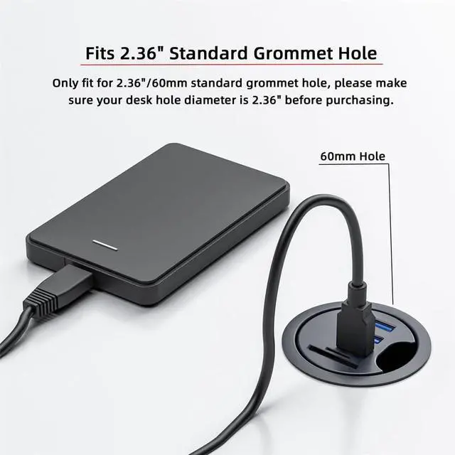 Standard Grommet Hole: Only fit for 2.36" /60mm standard grommet hole, please make sure your desk hole diameter is 2.36" before purchasing.