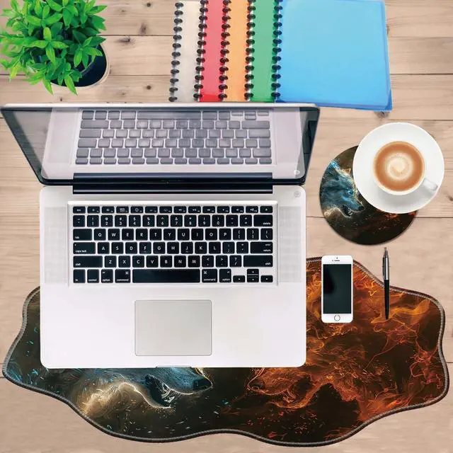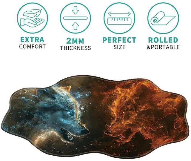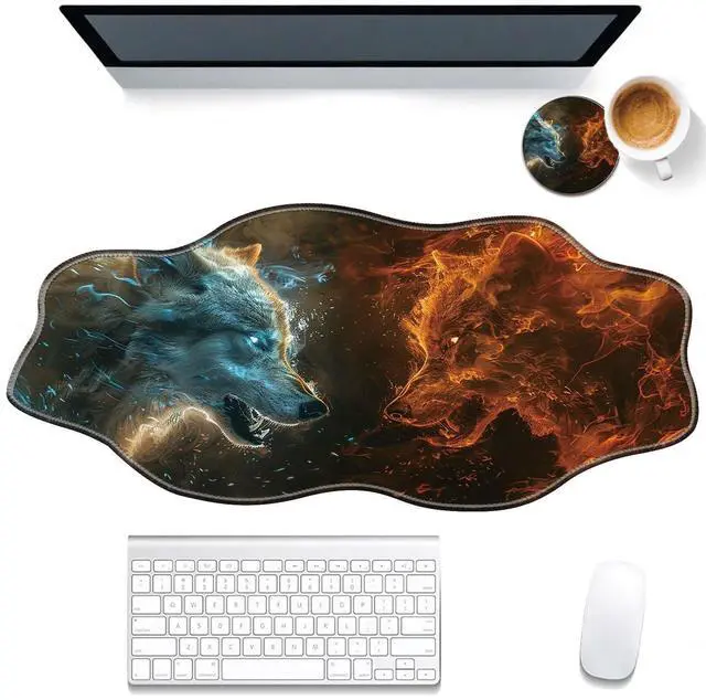 DHEEBFWE Large Gaming Mouse Pad for Desk,35.4 * 15.7in,Irregular Wavy Stitched Edges,XL Mousepad with Anti-Skid Rubber Base,Keyboard and Mouse Mat,Office Desk Writing Pad,Fire with Ice Wolf