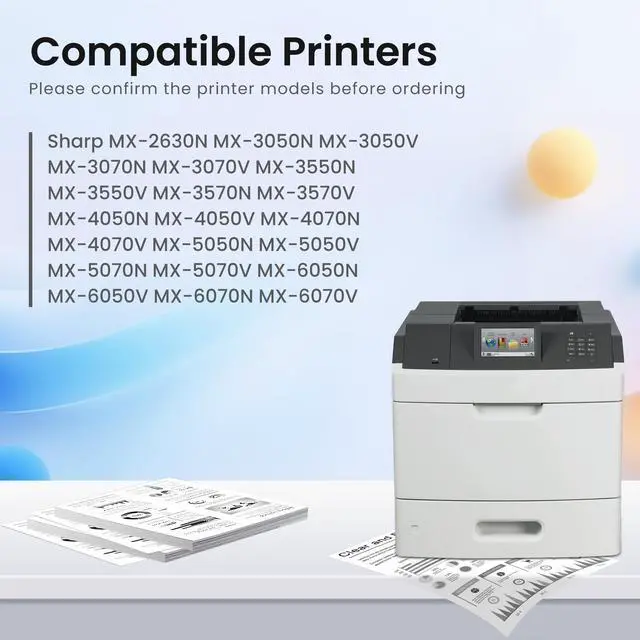 • Compatible Printers: compatible for Sharp MX3051 MX3061 MX3071 MX3551 MX3561 MX3571 MX4051 MX4061 MX4071 MX5051 MX5071 MX6051 MX6071 MX3560N MX3570N MX4050N MX4060N MX4070N MX5050N MX3060V MX3560V MX4060V MX3070V MX3570V MX4070V MX5070N MX6050N MX6070N MX3050V MX3550V MX4050V MX2651 MX2630N MX3050N MX3060N MX3070N MX3550N Printer