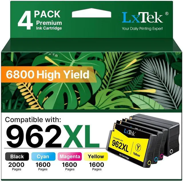 Ink Cartridges Combo Pack: LxTek 962XL ink cartridges combo pack for HP 962 962XL ink contains 1 * for hp 962XL Black, 1 * for hp 962XL cyan, 1 * for hp 962XL magenta, 1 * for hp 962XL yellowtotal 4 pack for hp 962XL ink cartridges combo pack). ^^ LxTek 962XL Ink Cartridges Combo Pack yields a massive 6, 800 pagesthat's 2.2 times the output of standard 962 ink cartridges combo pack. Each 962 XL black ink cartridges can produce up to 2, 000 pages, while the 962 XL ink cartridges color pack offer 1, 600 pages each, based on 5% coverage. It's the smartest choice for heavy users.