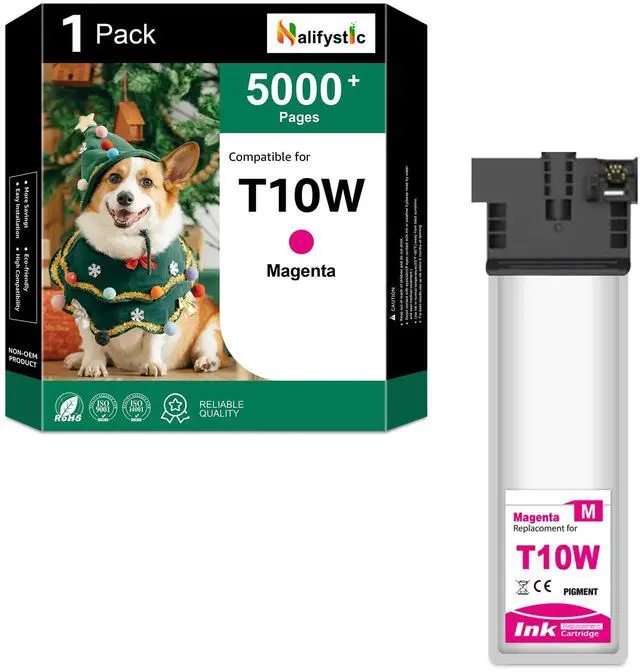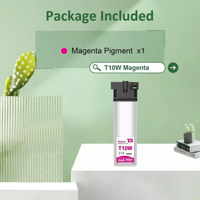 Remanufactured T10W Ink Cartridge Includes1 xT10W300 magenta Ink cartridge. ^^ Compatible for Printer ModelRemanufactured T10W Ink Cartridges for WF-C5390 WF-C5890 WFC5390 WFC5890 Color Printers. ^^ Remanufactured T10W Approx. Page YieldThese remanufactured T10W cartridge replacements for T10W each have up to 1, 000 pages and offer superior print performance and quality. ^^ Superior CompatibilityEach remanufactured T10W ink cartridge undergoes quality and functional tests before leaving the factory, ensuring the printing quality of the ink cartridge. Whether you print documents, presentations or charts, you will get reliable printing effect, just as if it won't damage the printer.