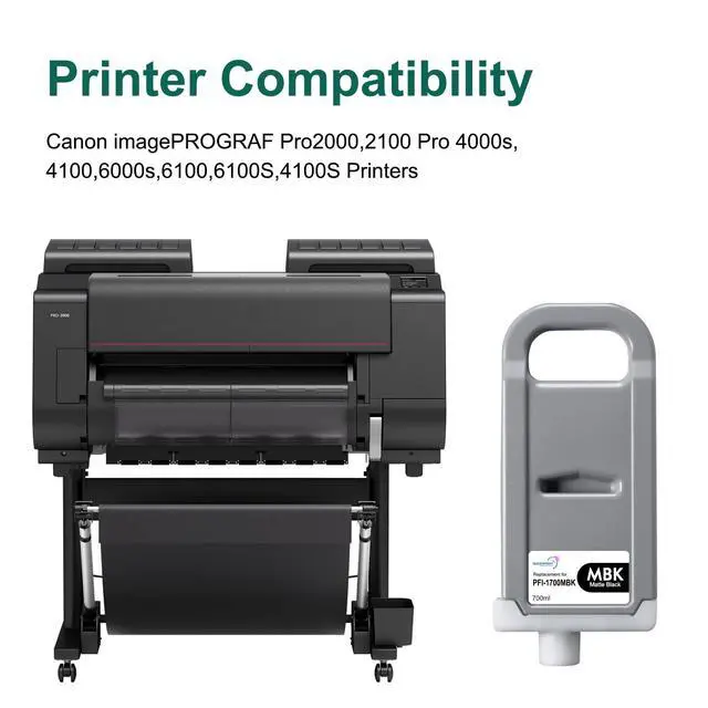 Printers: Perfectly work well with Canon imagePROGRAF Pro2000, 2100 Pro 4000s, 4100, 6000s, 6100, 6100S, 4100S Printers ^^ pfi1700 toner This high-yield PFI-1700 ink cartridge uses the latest chip technology and high-quality pigment ink, with an anti clogging nozzle design and easy installation. Provide clear text and graphics, comparable to the original. ^^ for canon pfi-1700 ink cartridgeOur PFI-1700 ink is a pigment ink with high concentration and contrast, which could clearly draw fine characters without color penetration. Pigment ink is waterproof and light resistant, and will not fade even outdoors, so it could keep the printed matter for a long time. You could trust this produc