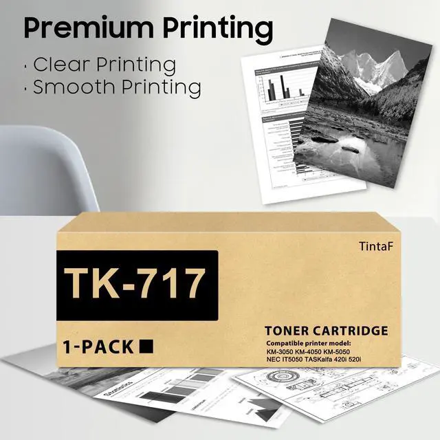 High Page Yield: TK-717 TK-717 toner cartridge Up to 34, 000 pages per black toner cartridge, Letter/A4 at 5% coverage ^^ TK-717 TK-717 toner cartridge upgrade material with high printing quality, clear text, high page yield ^^ TintaF compatible TK-717 TK-717 toner cartridge continues to provide you with high print volume, and smooth printing experience