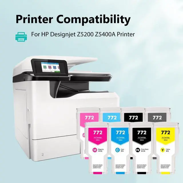 1Compatible PrinterFor HP DesignJet Z5200 Z5400 Printer. ^^ 2Reliable Quality For hp 772 Ink Cartridge is strictly tested prior to leaving the factory, with precise parts, cartridges will be fully compatible with your printer. With quality ink, print with sharp text and vivid color images.