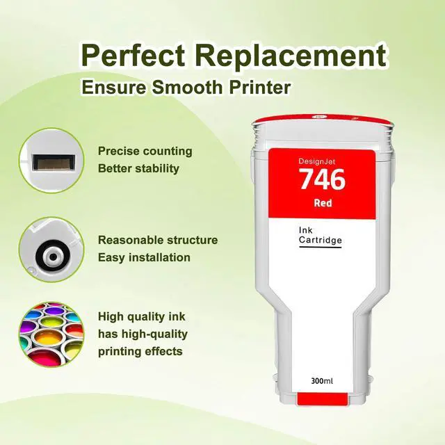 Compatible Model: Compatible for DesignJet Z6 DesignJet Z9+ Large Format Printer ^^ This high-yield 746 Chromatic Red ink cartridge uses the latest chip technology and high-quality ink, with an anti clogging nozzle design and easy installation ^^ High quality 746 Chromatic Red ink cartridge has high-quality printing effects, allowing more pages to be printed, reducing the frequency of replacing ink cartridges, and improving work efficiency ^^ We offer replacement/refund for all defects caused by our product. If you receive the item with problems, please contact us