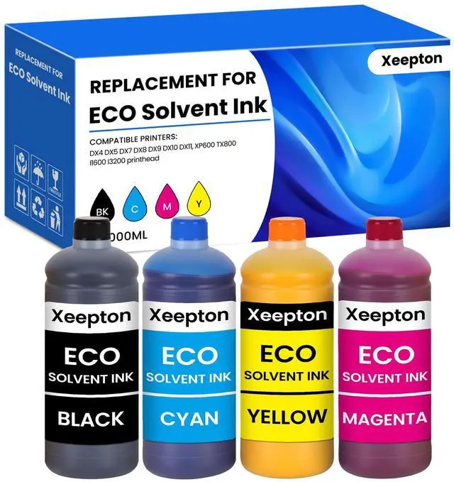 Compatible Printers: Xeepton Eco Solvent ink work with Mimaki Roland Mutoh, and other printers equipped with DX4 DX5 DX7 DX8 DX9 DX10 DX11, XP600 TX800 I1600 I3200 printhead ^^