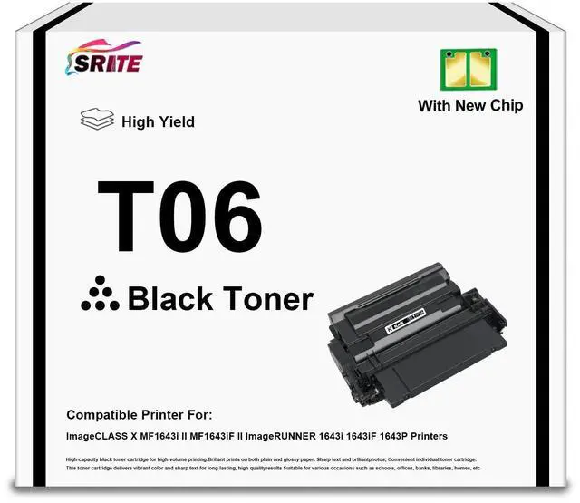 Precise CompatibilityBlack T06 toner (3526C001AA) Replacement for Canon ImageCLASS X MF1643i II, MF1643iF II, and ImageRUNNER 1643i, 1643iF, 1643P printer series, ensuring Compatibility and stable performance ^^ High Page YieldCost-Effective & Long-Lasting Each black T06 toner cartridge yields up to 20, 000 pages (at 5% coverage on A4 paper), ideal for high-volume printing needs and effectively reducing cost per page ^^ Smart Chip TechnologyInstant Recognition & Hassle-Free Use Equipped with a new smart chip for immediate printer recognition, avoiding compatibility issues and providing accurate toner level monitoring ^^ Excellent Print QualitySharp & Professional Output Utilizes high-quality toner formula to deliver crisp text and detailed image reproduction, meeting professional standards for office documents and graphics ^^ Professional Usage TipsAchieve Optimal Printing Results Before use, gently shake the cartridge horizontally several times to distribute the toner evenly inside.