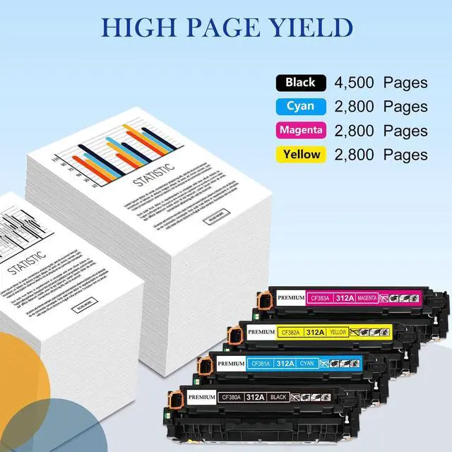 High Page Yield: Up to 4, 500 pages per 312A Black toner cartridge and 2, 800 page per 312A Cyan Yellow Magenta toner cartridge (5% coverage of A4 paper). ^^
