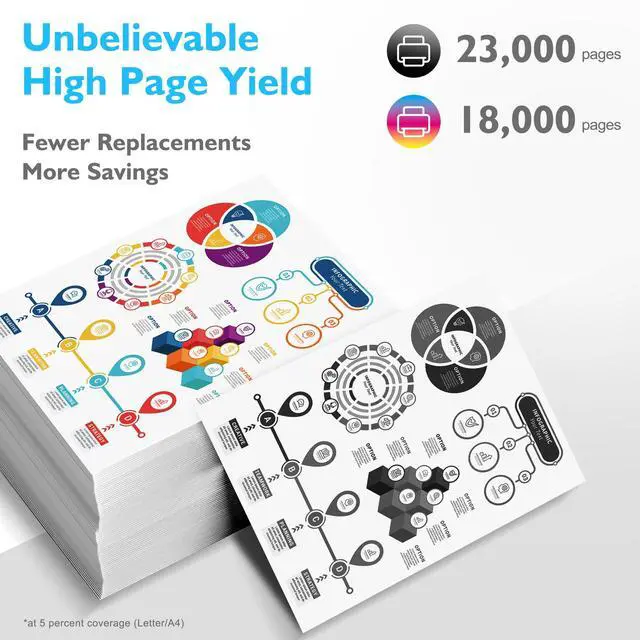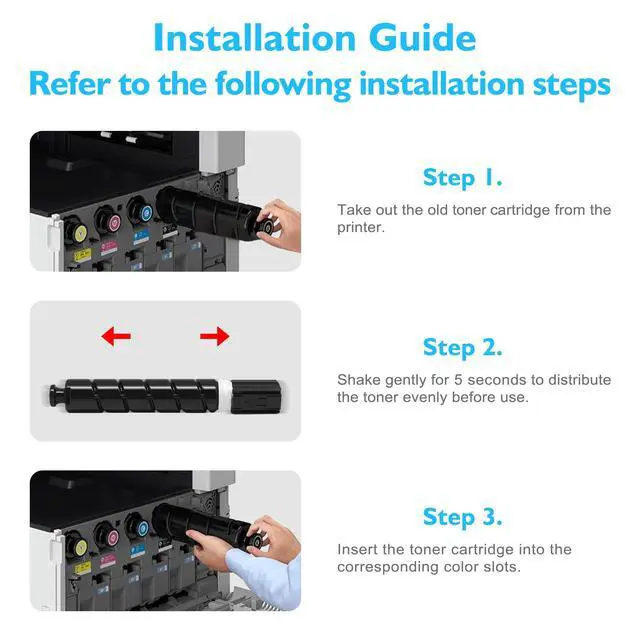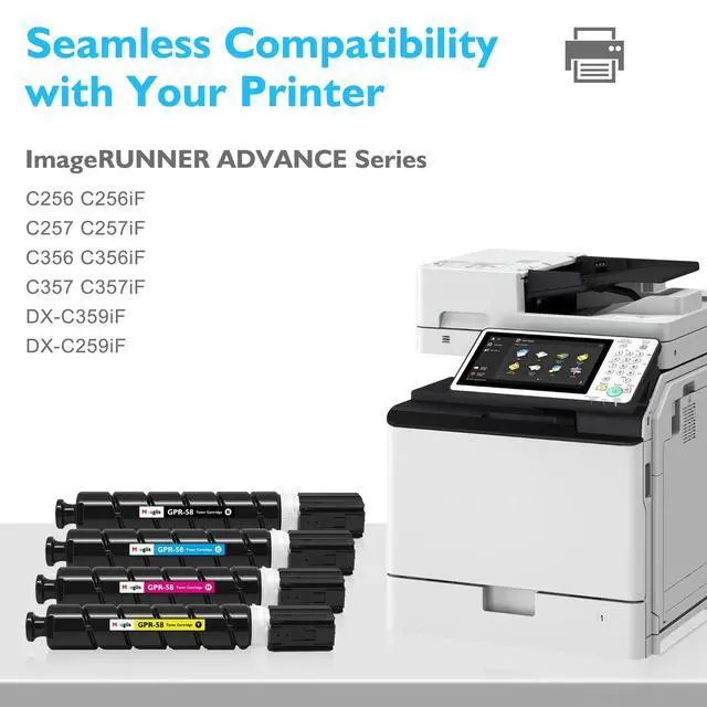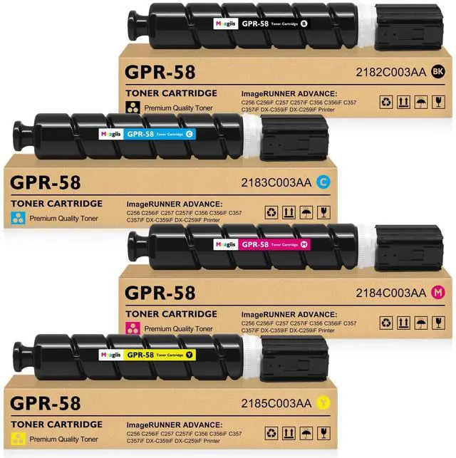 Applicable ModelsCompatible for Canon GPR 58 Toner to use with Canon imageRUNNER ADVANCE ( iR-ADV ) C256iF II, C256iF III, C356iF II, C356iF III and imageRUNNER ADVANCE DX C257iF, DX C357iF, DX C359iF, DX C259iF Series Printer ^^ High Page YieldUp to 23, 000 pages per GPR58 black toner and 18, 000 pages per GPR 58 color toner (Letter /A4, at 5% Coverage), ideal for users with high-volume printing needs and reducing frequent replacement and downtime, significantly saving cost per page ^^ Package Contents4-Pack GPR-58 Toner Cartridge (1*Black, 1*Cyan, 1*Magenta, 1*Yellow) ^^ Original Part Number2182C003AA, 2183C003AA, 2184C003AA, 2185C003AA ^^ Ultra-Fine Toner PowderThanks to the refined toner particles, our compatible toner for Cannon GPR58 delivers smooth, sharp and professional-quality prints every time.