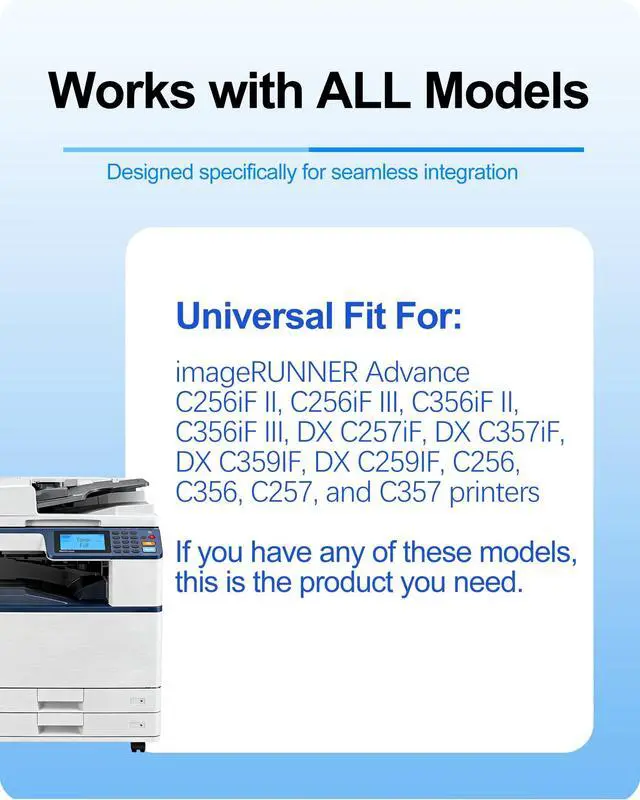 Compatible Printers: Engineered specifically for Canon imageRUNNER Advance C256iF II, C256iF III, C356iF II, C356iF III, DX C257iF, DX C357iF, DX C359IF, DX C259IF, C256, C356, C257, and C357 printers.