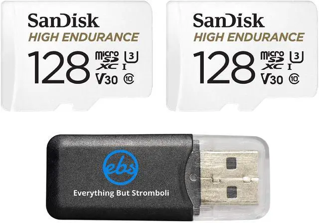 Bundle includes (2) 128 GB microSD SanDisk High Endurance memory cards with adapters and (1) Everything But Stromboli Micro Card Reader.