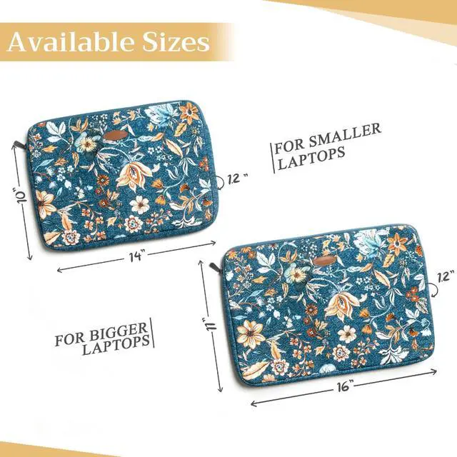 Artsy Designs and Vibrant patterns in vibrant colors provide huge visual interest, setting our bags apart. It is a versatile choice for just daily use, travel or commuting and a true delight to carry around. ^^ Comes in two sizes o Small 14 Width, 10 Length, 1.2 Deep (Outer dimension) Compatible with 12- 13.3 Laptops / Ultrabooks, 13- 13.5 Laptops / Notebooks / Ultabooks. o Large 16 Width, 11 Length, 1.2 Deep (Outer dimension) Compatible with 15 Macbook air / Macbook pro, 15.3 ipad pro and most 14- 14.56 Laptops / Notebooks / Ultrabooks.
