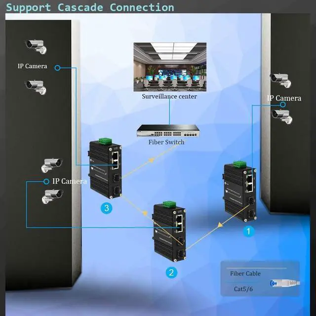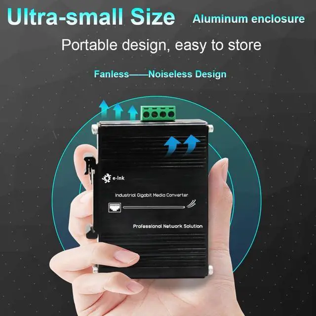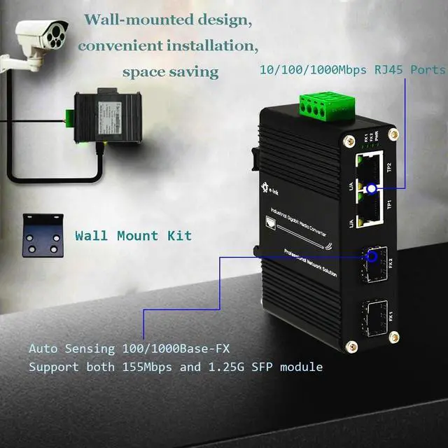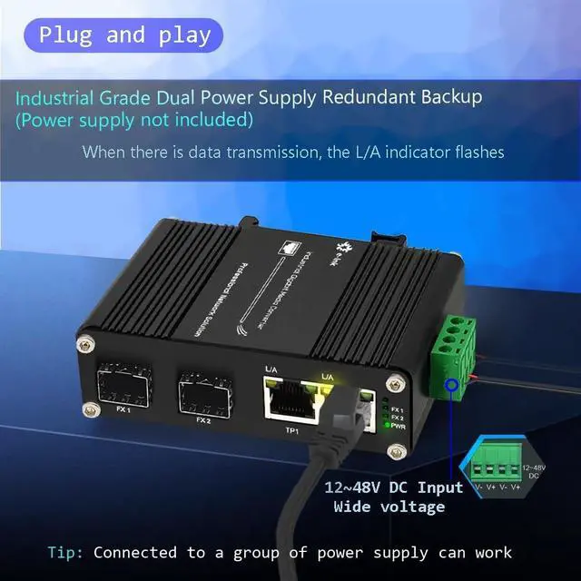 Auto Sensing 100/1000Base-FX The SFP ports support both 155Mbps and 1.25G SFP module, it means you can use other device with 100M or 1000M fiber port on the other side. ^^ 12~48V DC Input The media converter supports 12~48V DC input. Wide range voltage means you have more choice. And most probably dont need extra power adapter when you have centralized DC power supply. ^^ Support Cascade Connection The industrial switch with 2 SFP fiber ports, it supports cascade connection, and it can save fiber cable resources. ^^ Industrial Grade Quality Use industrial grade components and aluminum housing, it can work at wide range temperature -40C to 75C ^^ Din-Rail & Wall Mount The media converter comes with 35mm Din-rail clip and wall mount accessories.