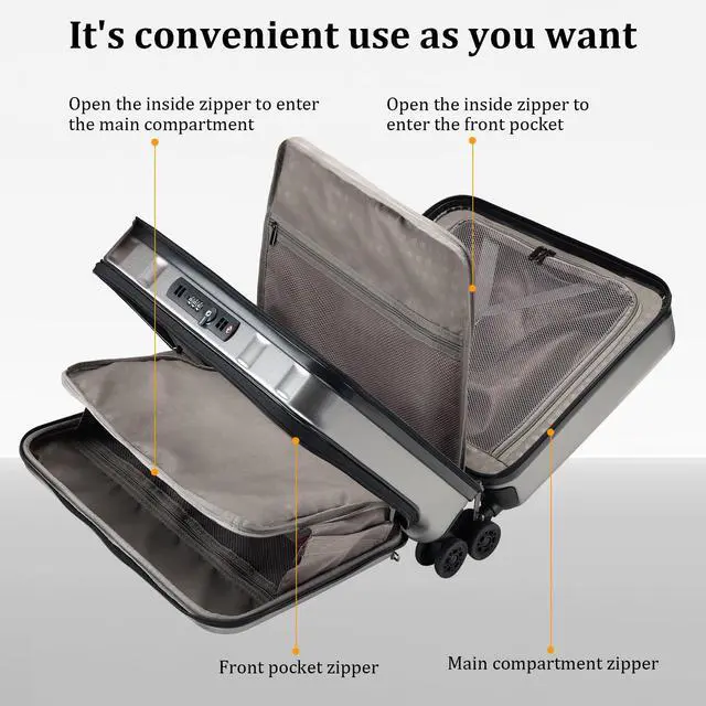YKK Zipper: The most feature is the dual lock security feature, you can unlock only the side you need or both sides at once. You can choose your own passcode and then to get the locks to pop off, just turn the dial left and/or right. The dual lock with TSA You are at ease knowing that the documents and electronic devices are secure at all times. With YKK zipper is smooth and long last, It ensures smooth and reliable closure, preventing the risk of zipper jams or breakage. ^^ Telescoping Handle & 360Silent