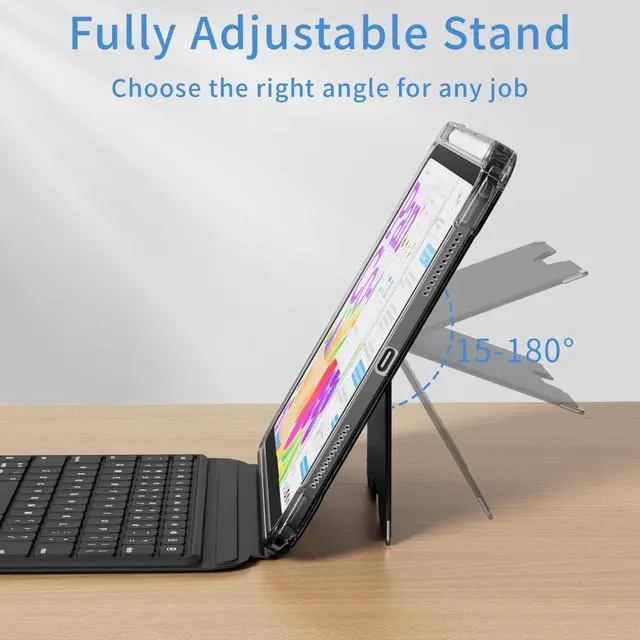 Flexible and Detachable Two-piece Design: Kickstand offers 180 of tilt to always have the right angle for the task at hand. Whether you want to view vertically or horizontally, just detach the keyboard and type.Landscape or portrait, your choice. Pull out the stand, and start typing at a comfortable angle, akin to using a laptop. The stand to be easily adjusted to the ideal angle for working on your lap at home or at a coffee shop table
