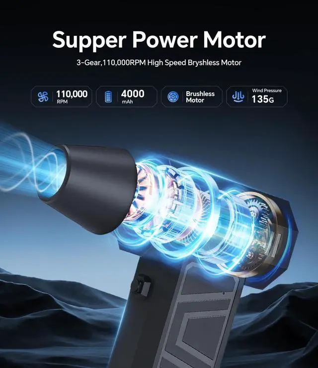Powerful Turbo FanElectric air duster reaches speeds of up to 110,000 RPM, effectively removing dust and debris. It features three adjustable speed settings to suit different cleaning tasks.