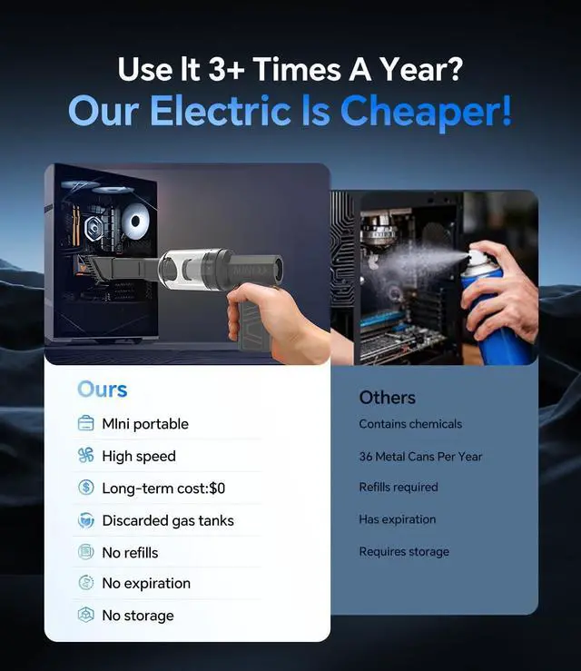 Economical & Eco-FriendlyThis rechargeable air duster is made of durable ABS composite material. Replaces over 5,000 cans of compressed air. Saves money and eliminates freezing liquid spray risks. Paying for itself in just 3 uses.