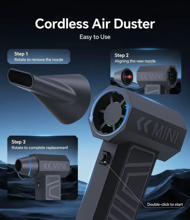 Multifunctional Cleaning ToolEquipped with 7 nozzles, this high-performance electric air duster is perfect for cleaning electronics like PCs and keyboards, as well as home, car, and outdoor use. Its even great for BBQs, snow blower or campfires, making it a must-have tool for any situation.