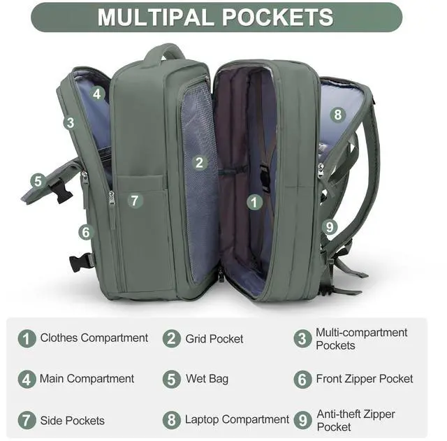 This backpack meets the boarding requirements and can be opened and folded 180 degrees like a suitcase, which can quickly pass through airport security and is specially designed for plane travel. ^^ Comfort and Safety Comfortable airflow back design, thick and soft multi-panel ventilated padding provides back support. Breathable, adjustable shoulder straps and a chest buckle to relieve shoulder pressure. This backpack can be slipped on the trolley of the suitcase to make traveling easier. Hidden anti-theft zipper pocket on the back of the backpack to prevent your valuables from being stolen.