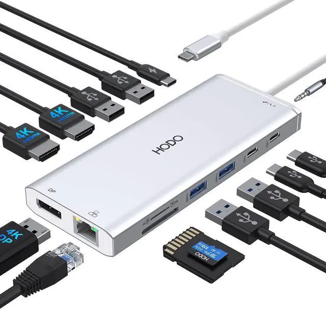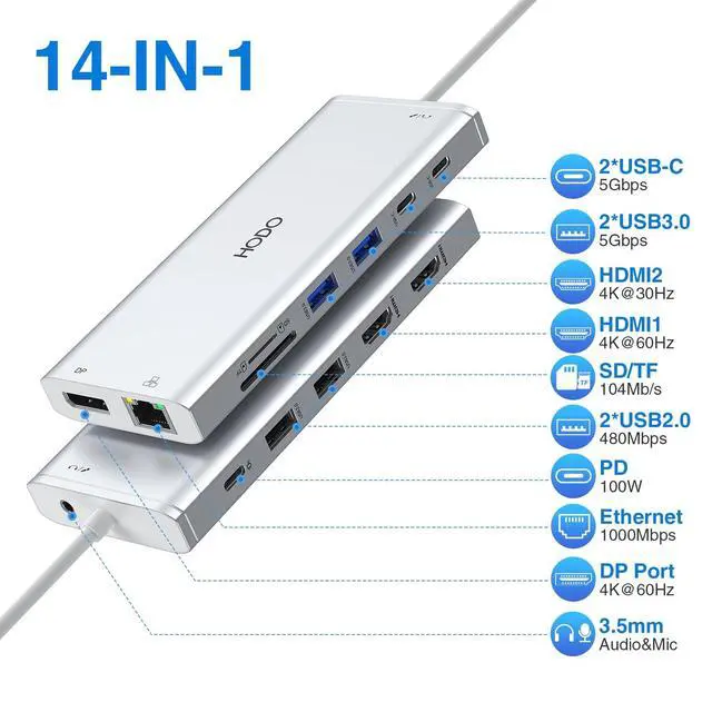 IN 1: With this Docking Station Dual Monitor, you can easily fulfill your daily use by extending one USB C port to Dual Monitor 4K HDMI, Displayport, Gigabit Ethernet, 2 USB 3.0 ports, 2 USB 2.0 ports, USB C Power Charging Port (max 100W), 2 USB C Data Transfer port (5Gbps), SD/Micro SD card readers and 3.5 mm Mic/audio. USB C Hub Multiport Adapter for Windows.