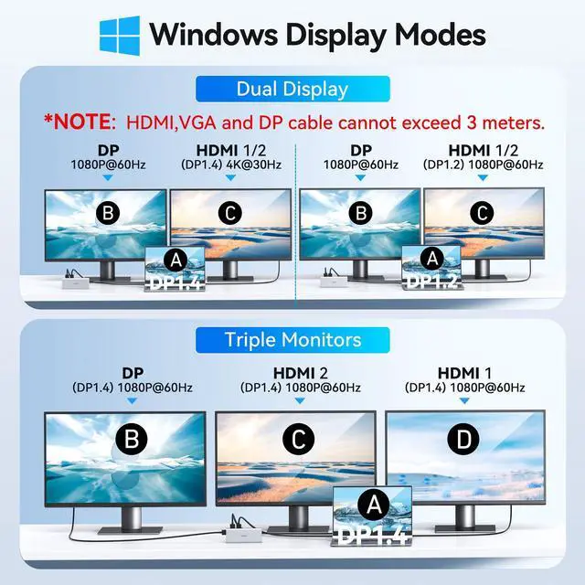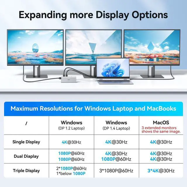 Monitor DP (1080P): This USB C Docking Station Dual HDMI Splitter for laptop will help you easily to achieve dual-monitor and triple-monitor display, make your work/life more efficient;