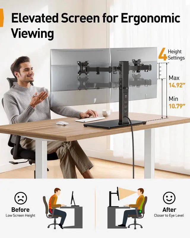 Cable Management: Our monitor desk stand features a built-in power strip with 6.5 ft power cable. It has a USB-A port, USB-C port, and three AC outlets. Easily power all your devices directly on your desktop. Cable management keeps everything organized.