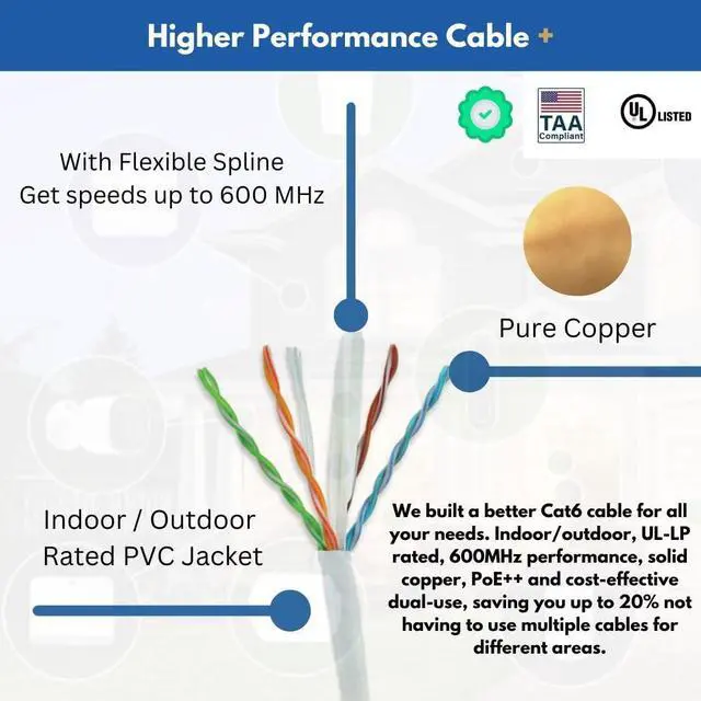 Run cable indoors and outdoors with Cat6 performance. Coming in an easy to pull box this 1000ft cable is perfect for in walls, room to room, network rooms, warehouses, outdoor cameras, access points, residential networks, gaming, riser runs, you name it this cable can do it.