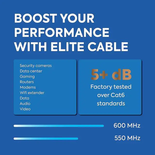 Factory tested to 600MHz and a dB rating of up to +5 over transmission performance we built this cable for high speeds and performance in all installation environments.