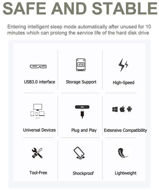 Package Includes: 1x Portable external hard drive1 x 2in1 USB Cable1 x User's manual