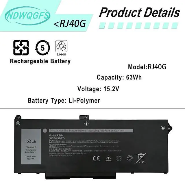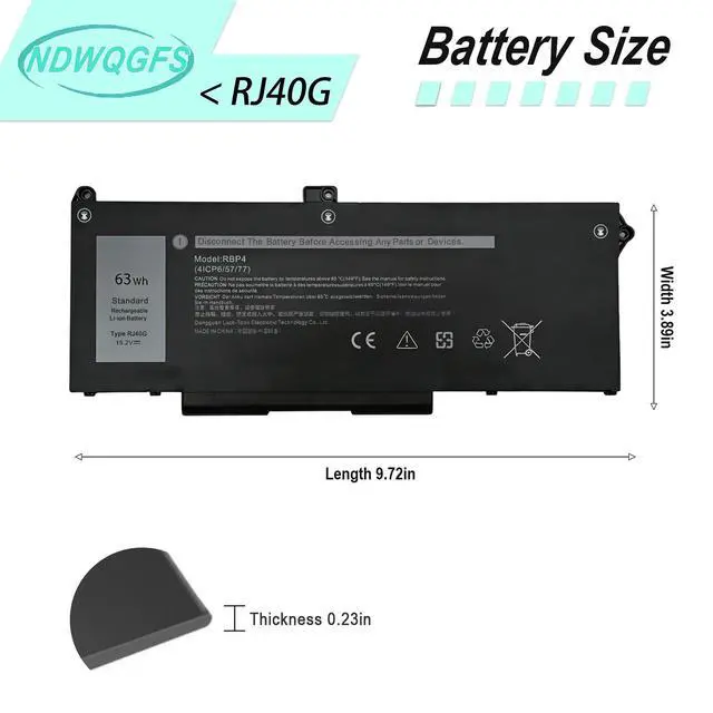Precise Compatibility Specifically designed for Dell Latitude 14 5420, Latitude 15 5520, Precision 15 3560, and models P137G (P137G001), P104F (P104F001/P104F002). Replaces part numbers RJ40G, 01K2CF, 075X16, 0WK3F1, 0M3KCN, 005R42. ^^ High Capacity & Stable Power 4-cell Li-ion battery with 63Wh/3941mAh capacity and 15.2V output provides reliable, extended runtime for work, travel, and everyday use. ^^ Important Compatibility Note Your Dell laptop may use either the 63Wh RJ40G or a 42Wh (WY9DX) battery. Check your original battery model before ordering to ensure the correct fit.