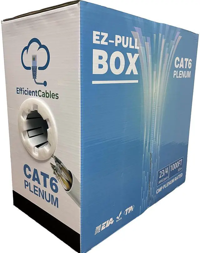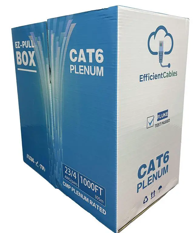 Efficient Cable Cat6 Plenum UTP (Unshielded Twisted Pair) Ethernet 1000FT Cable. 23AWG conductor insulated with HDPE to stop external attacks. Cat6 Plenum cable is used in building plenum spaces for smooth and easy installation. 4 pairs with spline put together to form a core and ripcord full length of cable to make it easy to tear the cable. Its core is jacketed with a low smoke flame retardant PVC. Tested Up to 550MHz bandwidth support. Available in Blue, White, Black, and Yellow color.