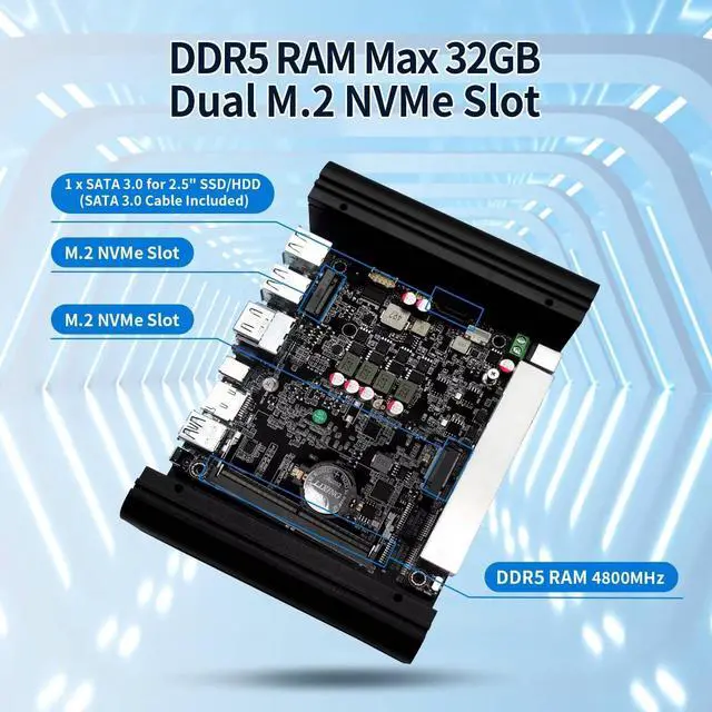 2 NVMe Slot: Tiny hardware firewall with 1 x DDR5 SO-DIMM, 2 x M. 2 2280 NVMe SSD slot, 1 x SATA 3.0 for 2.5" SSD/HDD (SATA 3.0 Cable Included) ^^ Support 12V 4Pin 8010