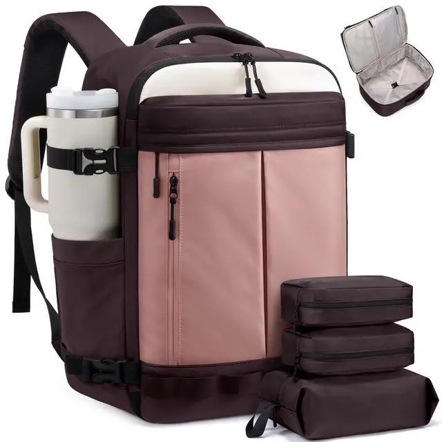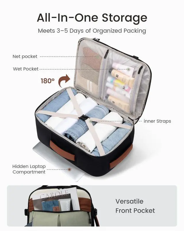 Airline Approved Carry-OnMeasuring 14818 inches, this travel backpack fits under the seat or in overhead bins. Approved by Spirit, Frontier, JetBlue, and more, its the perfect personal item travel bag for short trips, business flights, and weekend getaways. ^^ 40L Capacity One Bag, Everything PackedWith a spacious 40L design and 180 suitcase-style opening, this carry on backpack makes packing effortless. The roomy main compartment, mesh pocket, and wet section organize clothes, toiletries, and travel essentials for 35 days. ^^ 3 Packing Cubes IncludedThis travel bag comes with 2 packing pouches for toiletries and undergarments plus a separate shoe bag.