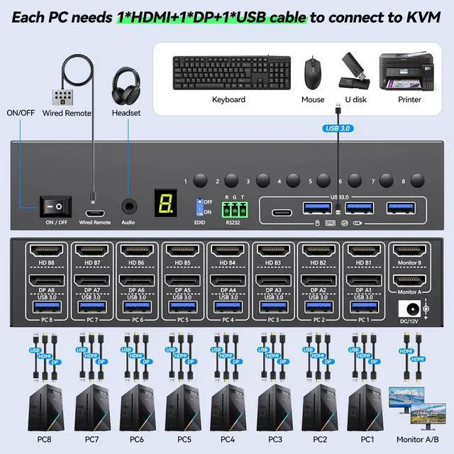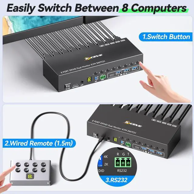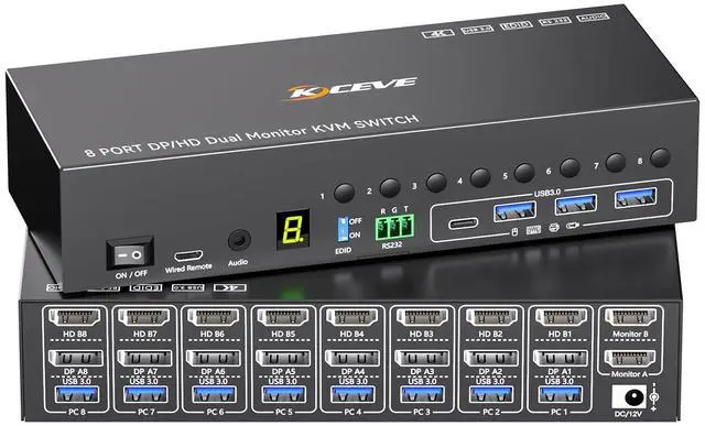 remote control (length: 1.5 m, with digital screen display, included) and RS232 (please use at baud rate: 115200). ^^ Great Compatibility Just plug and play, 8 PC two monitors KVM switch DP HDMI driver-free for Windows, Mac OS, Linux and Chrome. Compatible with most devices such as Desktop, Laptop, Mini Box. It is widely applied for home, office, games, server room, etc. ^^ Important NotePlease make sure to connect the included 12V/2A power adapter to supply power to the KVM switch. ^^ What you will Get Camgeet provides 1 year war--ranty and lifetime technical support for this 8 ports KVM Switch.: 8 port KVM switch; 8*USB 3.0 Cable( 1.5M ); 1*Wired Remote( 1.5M ); 1*12V/2A Power adapter and 1*User Manual. Any problem, 24-hour professional customer service.